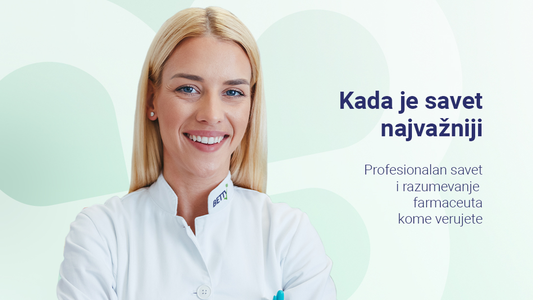 Kada je zdravlje u pitanju, najvažnije je poverenje da ćete, kada Vam je to potrebno, pronaći pravu informaciju uz puno razumevanje stručnog lica koje je tu da Vam pruži savet ili pomoć, a mi se trudimo da u apotekama sa oznakom BETTY obezbedimo visok nivo usluge, kroz visoko obučen kadar.